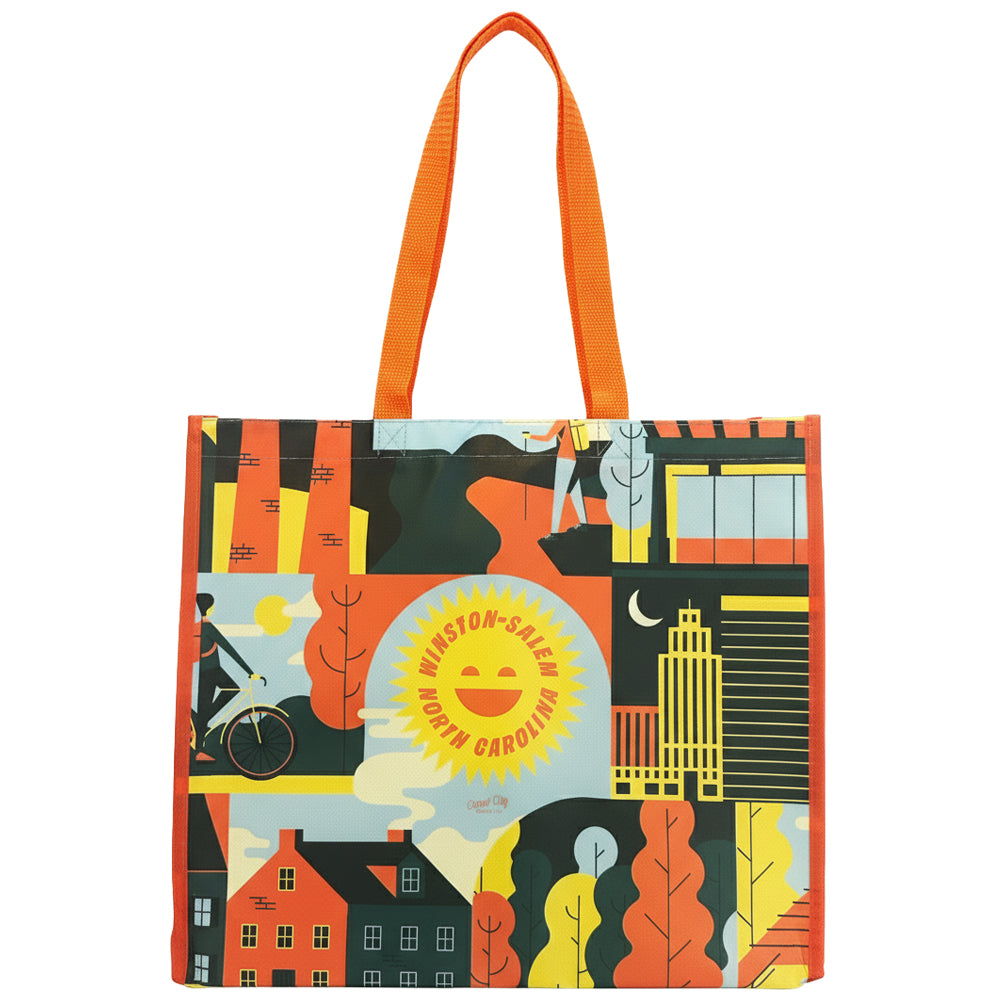 Carry a little piece of the city with you wherever you go. This reusable grocery tote features our custom illustrations celebrating landmarks and everyday scenes from around Winston-Salem, NC. Built for both style and function, it’s spacious enough for your weekly grocery run and durable enough for everyday use.